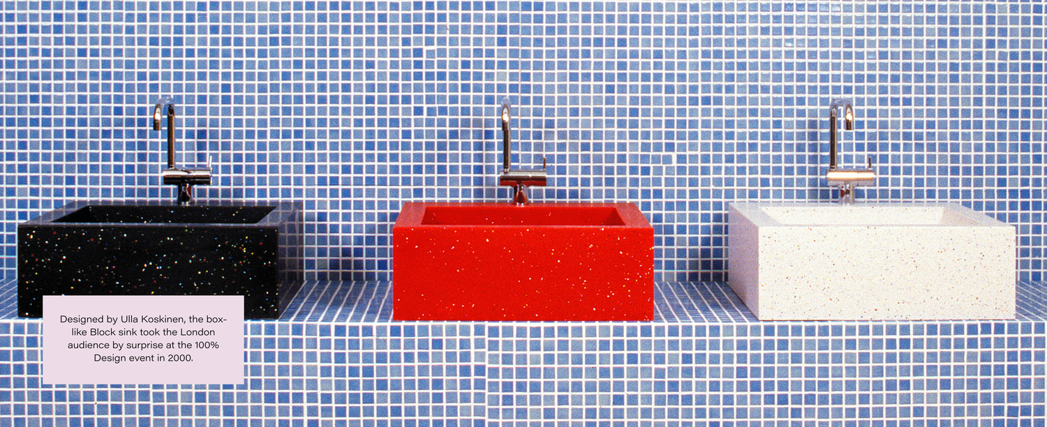“The red Block sink, designed by Ulla Koskinen, with its box-like design and made from recycled materials, and the entire stand left the London audience speechless. The labyrinthine space was bustling with people and after the event inquiries came in from all over the world,” recalls Ulla Tuominen.