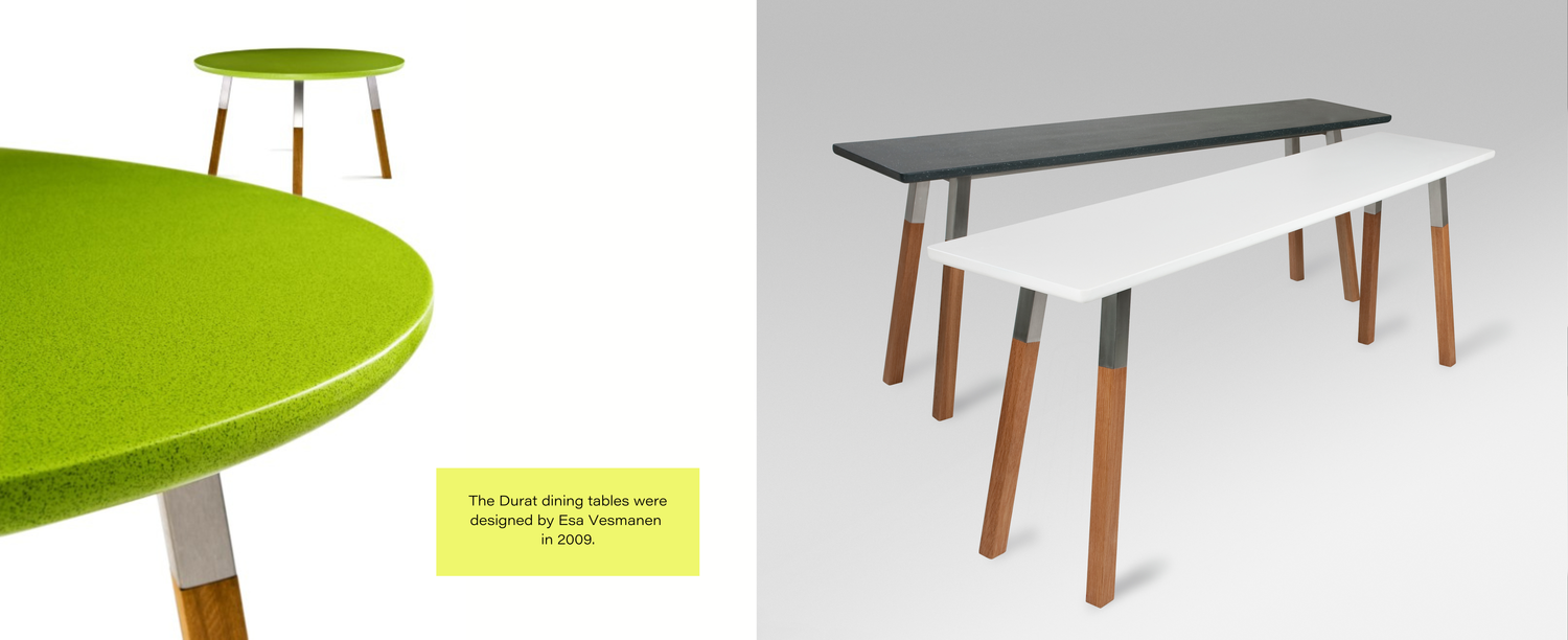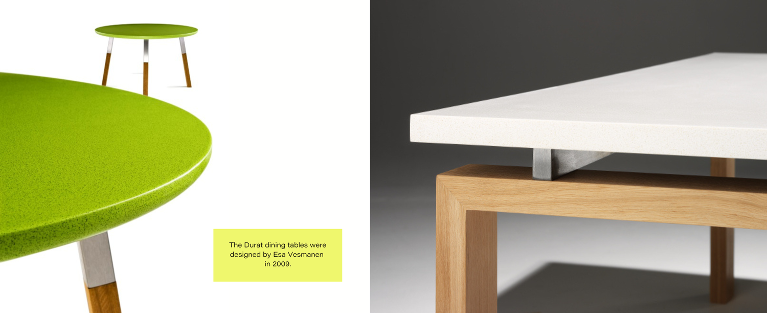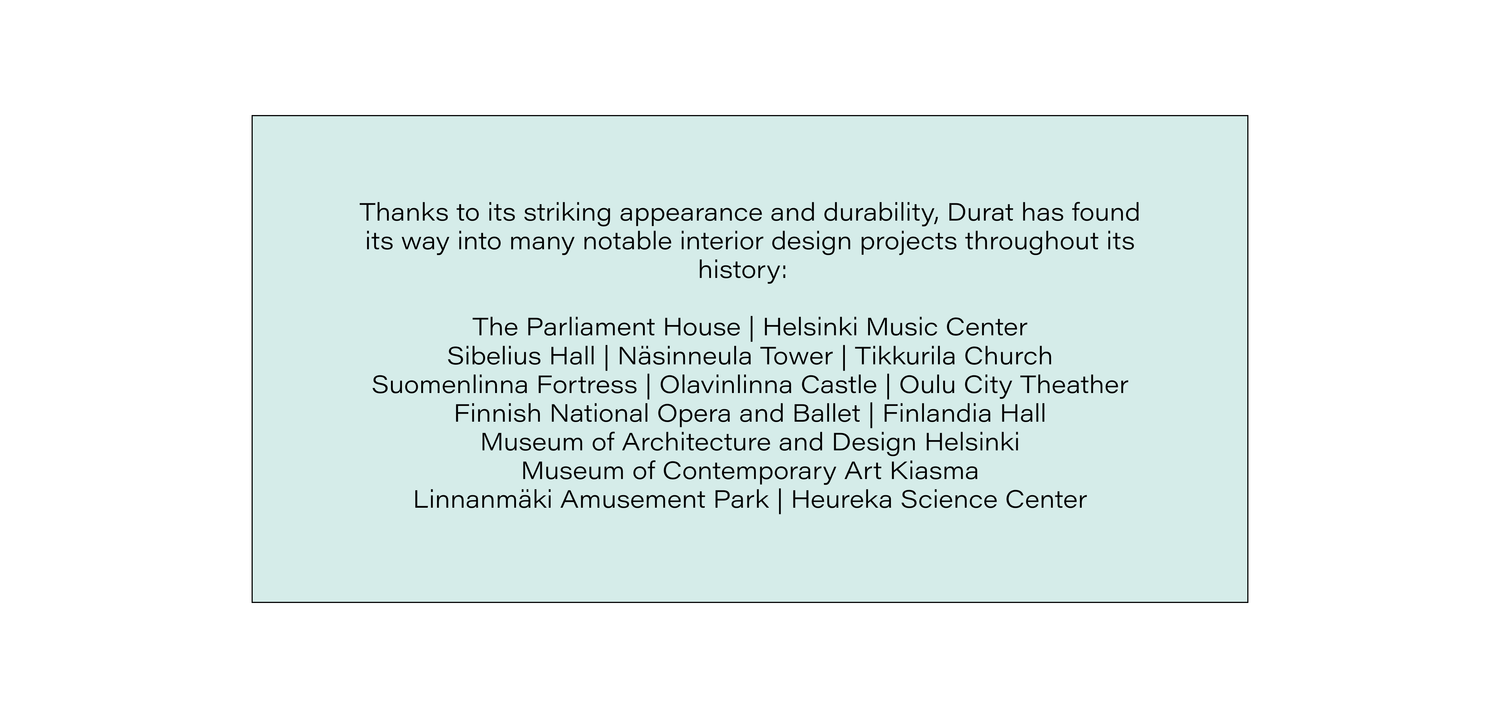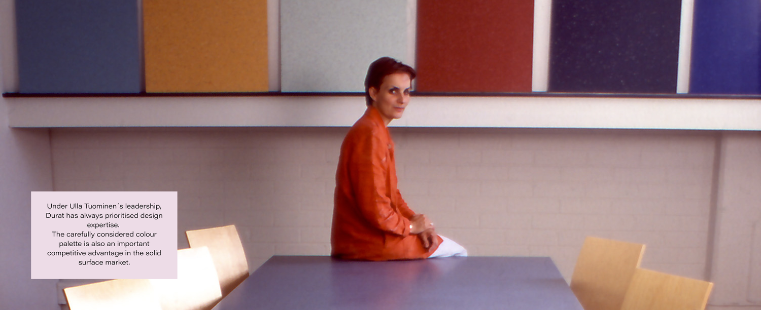 Ulla had a solid background in art and, before founding Durat, had worked for one of Finland's most renowned interior designers, Pirkko-Liisa Topelius. That is why the importance of design has been emphasized in product development from the very beginning. The goal was, and still is, to develop a material that would be suitable for decorating even the most demanding interiors, both in terms of quality and visual appeal.