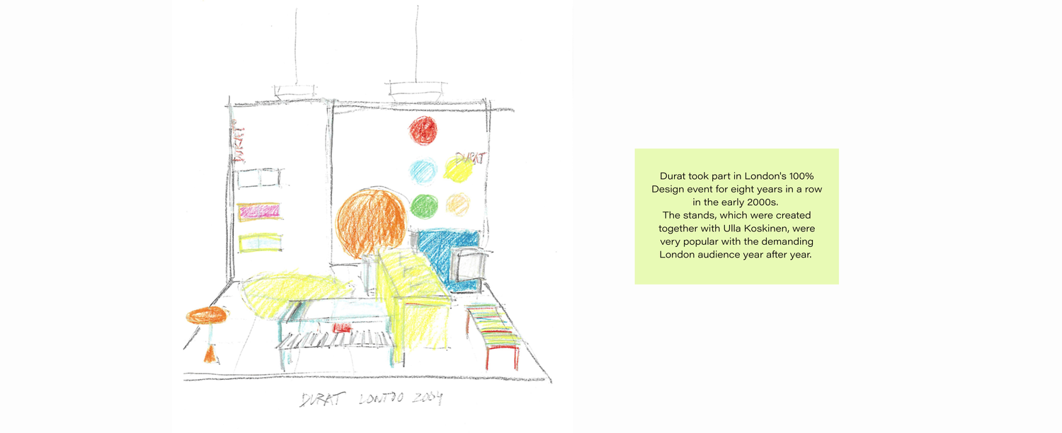 At the start of the 21st century, Durat set its sights on the international market. The company participated in the Finnish Habitare fair in 1998, and Ulla found a young, up-and-coming couple, Ulla Koskinen and Sameli Rantanen, to design the exhibition stand.