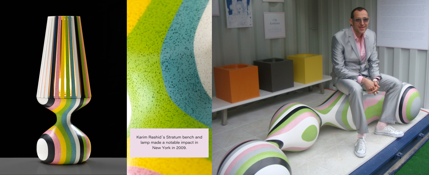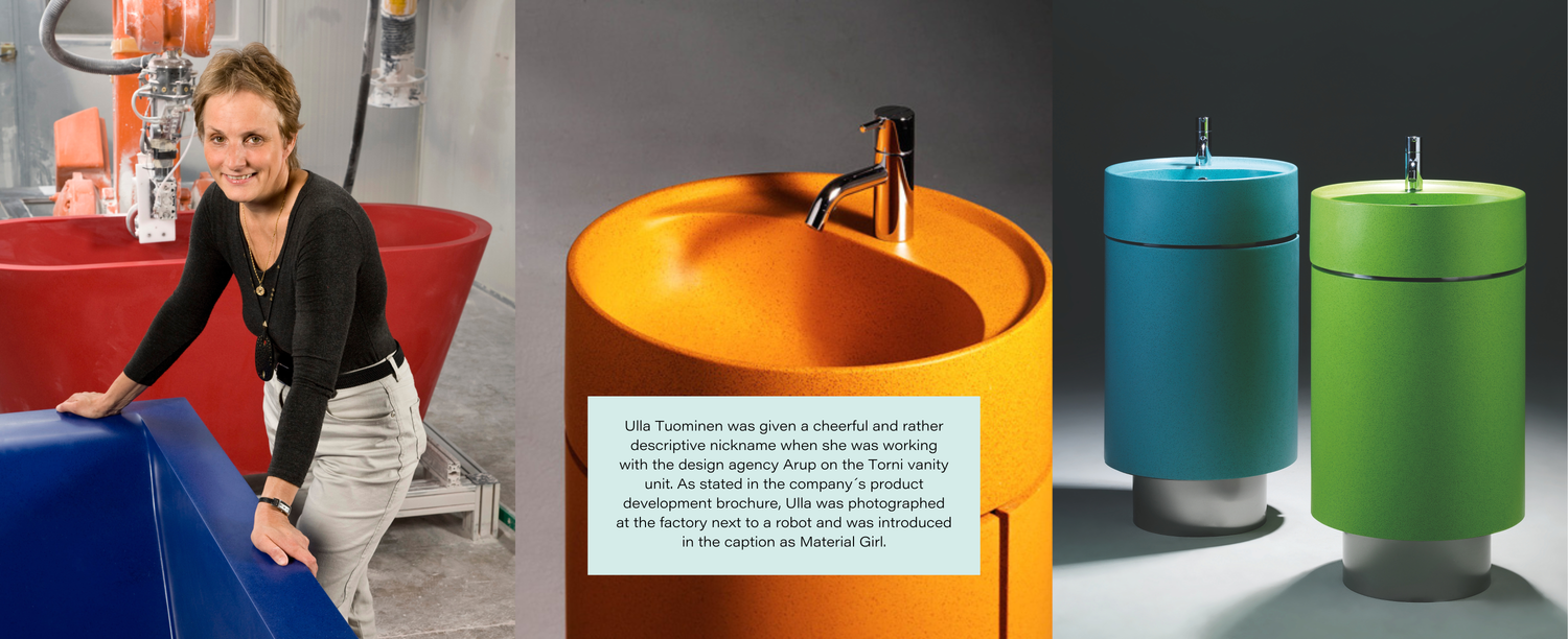 Under the leadership of Ulla Tuominen, product design has always focused on strong design expertise. The company boldly entered the design fairs, although solid surface manufacturers usually attended material fairs.