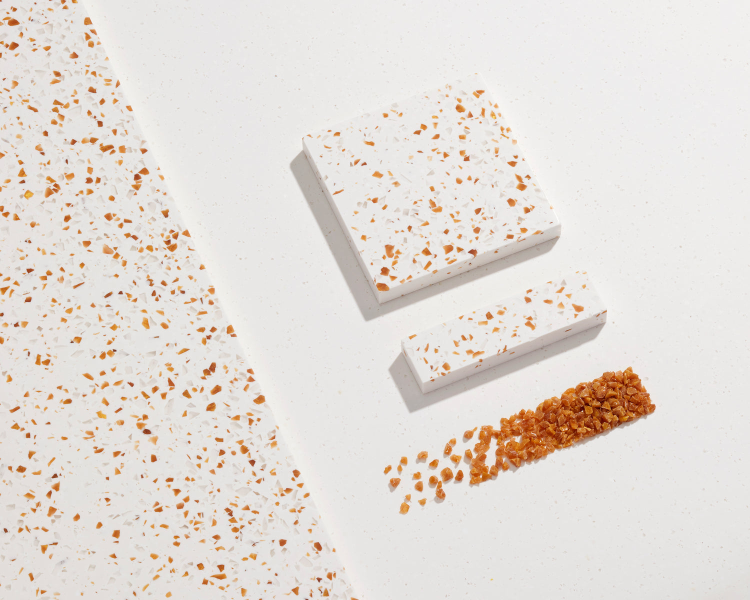 Maailman ensimmäinen PET-hartsia ja kierrätettyä solid surface -komposiittia yhdistävä Durat Plus sisältää noin 55 prosenttia kierrätysmateriaalia.