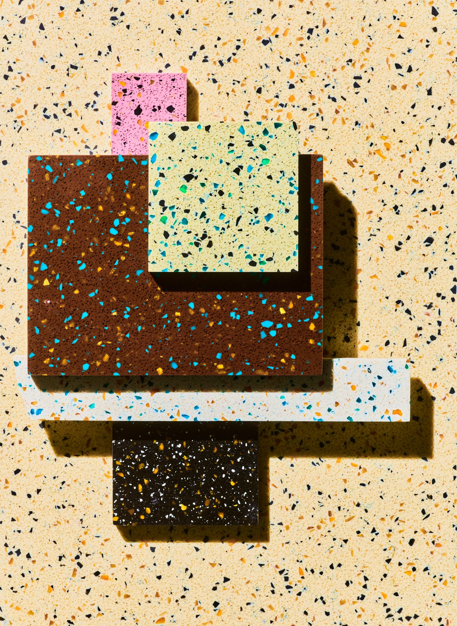 Isoissa terrazzo-henkisissä väripilkuissa on 4 vaihtoehtoa: Kirkas, musta, moniväri, valkoinen.